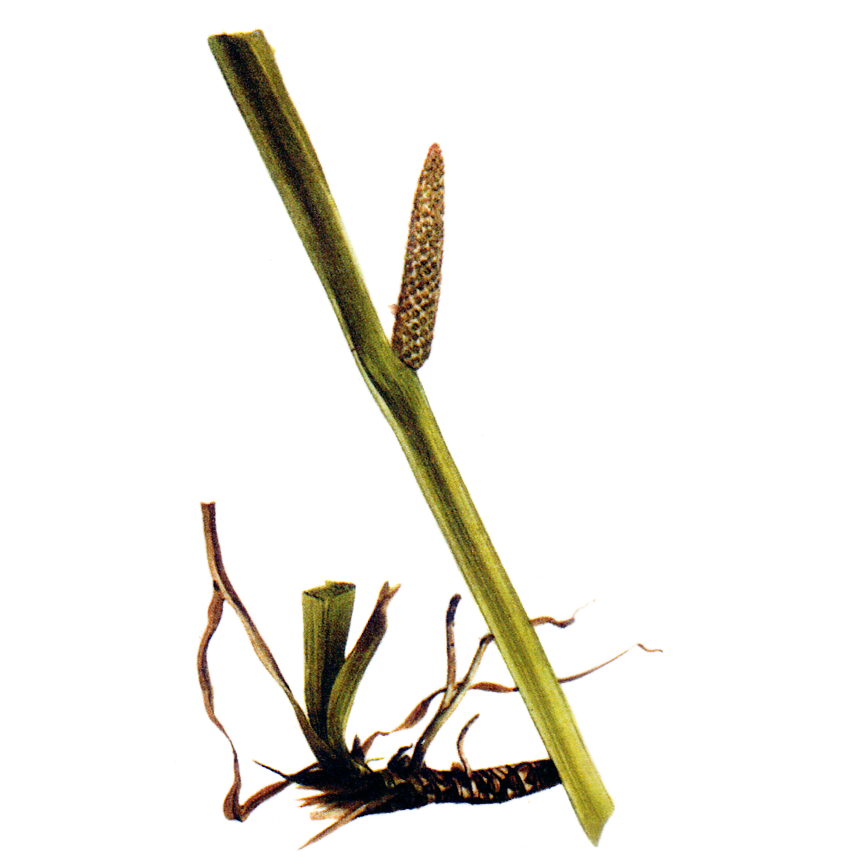 This aquatic plant grows by ponds, lakes, marshes and the banks of quiet waters. The rhizomes out of which numerous swordshaped leaves shoot up to 1 metre high, creep horizontally through the mud at water's edge. The flat scrape carries in its middle a cone-shaped, greenish to brownish yellow, spandex. The root, the thickness of a thumb and up to 1 metre long, has a pungent, bitter taste when fresh. When dried the taste is milder. The roots are gathered in early spring or late autumn.